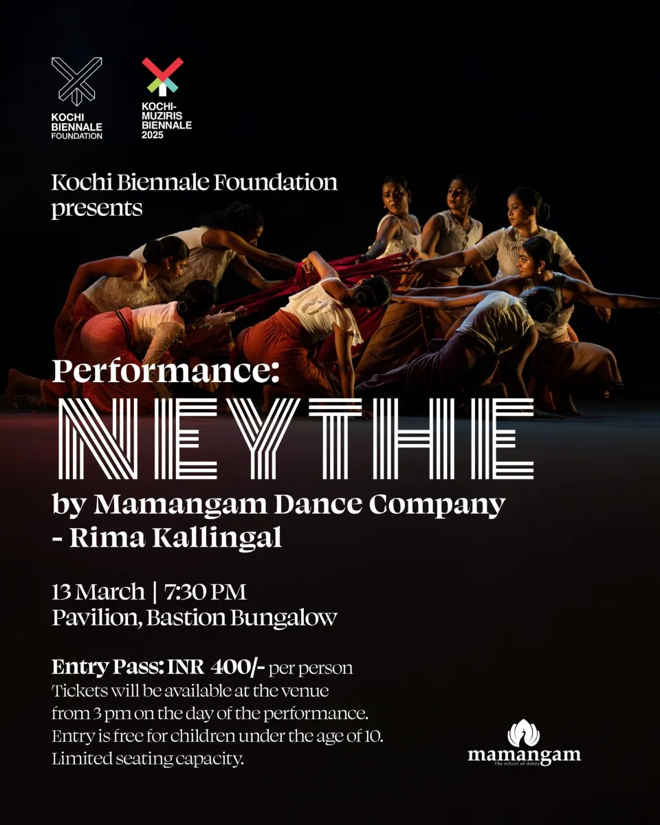 oin us for Neythe – Dance of the Weaves, a performance by Mamangam Dance Company led by Rima Kallingal. Drawing inspiration from the organic choreography and body movements of artisan weavers, Neythe recreates on stage the journey from thread to cloth. Through movement, the performance reflects the rhythms of weaving, the tools and processes involved, and pays tribute to Kerala’s rich handloom heritage and the human craftsmanship behind it. Entry Pass: 400 Rs per person Tickets will be available at the venue from 3 PM on the day of the performance. Free entry for children under 10. Limited seating capacity. 13 March, 7:30 PM Pavilion, Bastion Bungalow, Fort Kochi. #KochiMuzirisBiennale #KochiBiennaleFoundation #ForTheTimeBeing #NikhilChopra #KMB2025