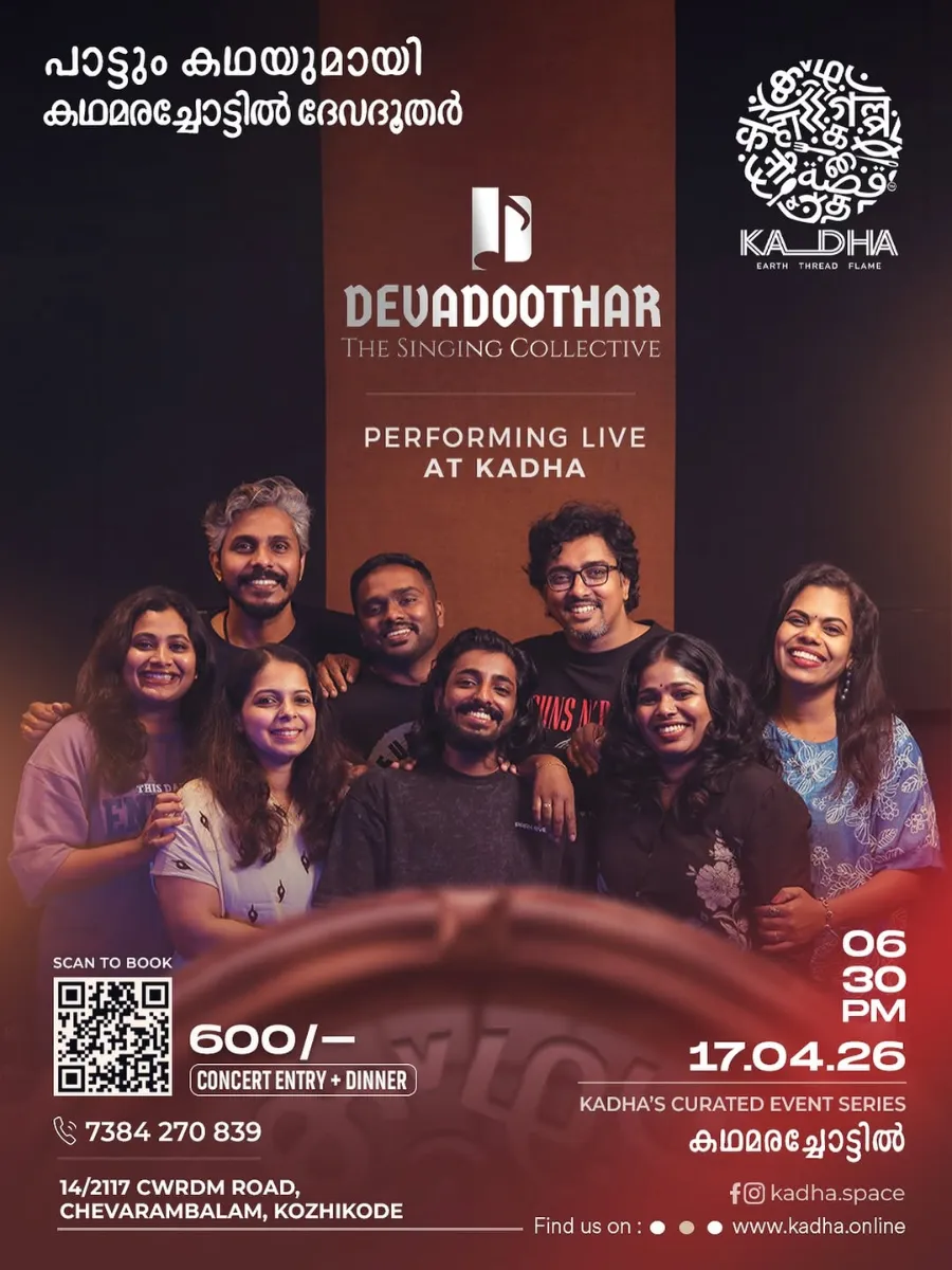 Kadha is coming with yet another soulful evening ✨ This time, we’re bringing you @devadoothar_official – The Singing Collective for a live musical experience that feels warm, nostalgic, and alive. Good music, cozy vibes, and a table full of comfort food — sounds like the perfect evening, right? Join us for a night where stories are sung, moments are shared, and memories are made. 📍 Kadha, Kozhikode 🗓 17.04.26 | ⏰ 6:30 PM 🎟 Concert + Dinner: ₹600 Come for the music, stay for the feeling. 🤍