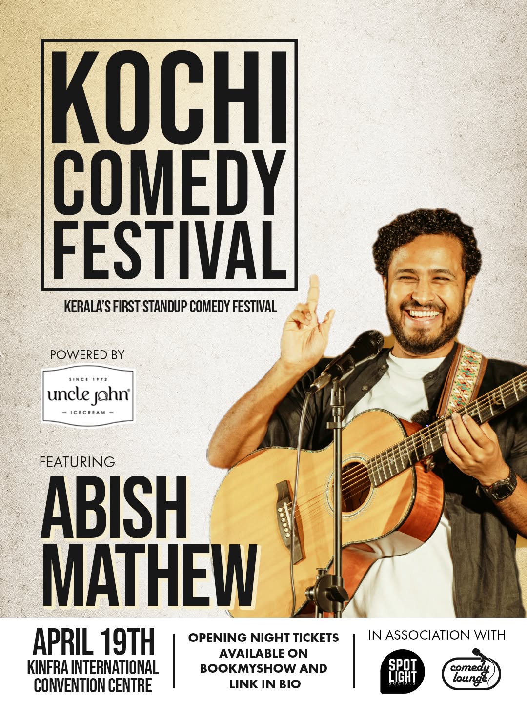 Abish Mathew (@abishmathew) is performing at the Kochi Comedy Festival Opening Night — one of India’s most recognised comedians, known for his sharp writing, musical comedy, and standout performances across platforms. Tickets are now live on BookMyShow, have you bought your tickets yet? Tickets are flying off the shelf, buy yours now! 📅 April 19 📍 Kinfra Auditorium, Kakkanad Curated by @comedyloungekochi Powered by @unclejohn.icecreams #ComedyLounge #KochiComedyFestival #KochiEvents #AbishMathew #StandupComedyIndia #ThingsToDoInKochi