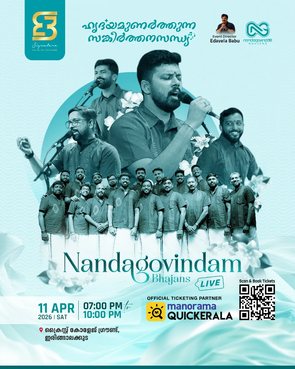 ✨ഭക്തിയും സംഗീതവും ഒന്നിക്കുന്ന അതുല്യ സായാഹ്നം! 🎶 ഇരിങ്ങാലക്കുടയിൽ ‘നന്ദഗോവിന്ദം ഭജൻസ് ലൈവ്’ വരുന്നു ✨ ഈണങ്ങളിലൂടെ ഒരു ദിവ്യാനുഭവം🙏 📍ക്രൈസ്റ്റ് കോളേജ് ഗ്രൗണ്ട്, ഇരിഞ്ഞാലക്കുട 📅 ഏപ്രിൽ 11, 2026 | ⏰ വൈകിട്ട് 7:00 മുതൽ 👇🎫 ടിക്കറ്റുകൾക്കായി ക്ലിക്ക് ചെയ്യൂ: