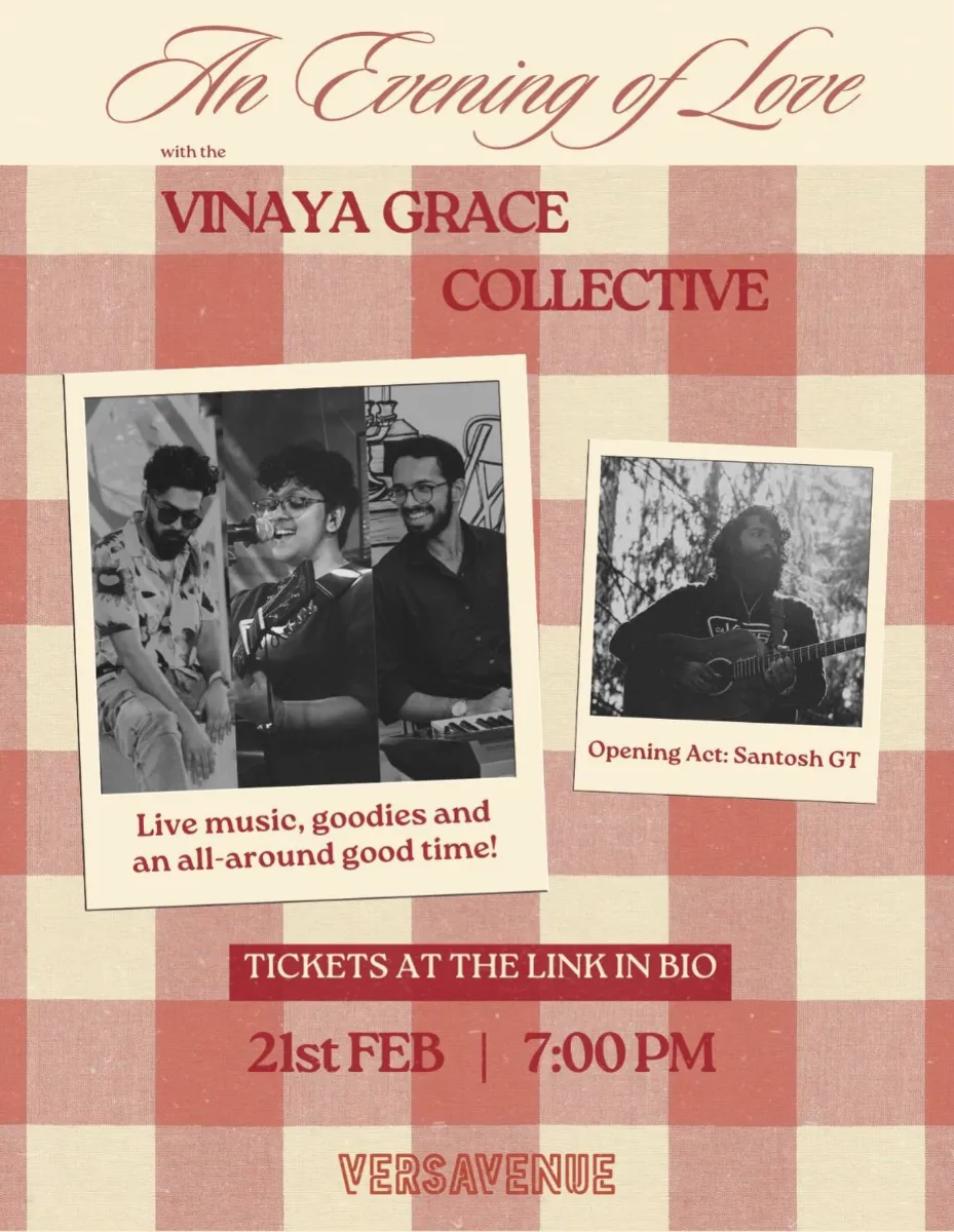 An Evening of Love ,soulful sounds, easy smiles, and all-around good vibes with the Vinaya Grace Collective. š 21st Feb | 7:00 PM š VersaVenue, Chilavanoor road Elamkulam, Kochi. Contact us: +919895812305 Come for the music, feel things, sing along,stay for the magic. Register here : https://docs.google.com/forms/d/e/1FAIpQLScnAF-sLfTRja90TUerLlRET-xD250GuSNyEgsNPic_mpNWjg/viewform?usp=publish-editor